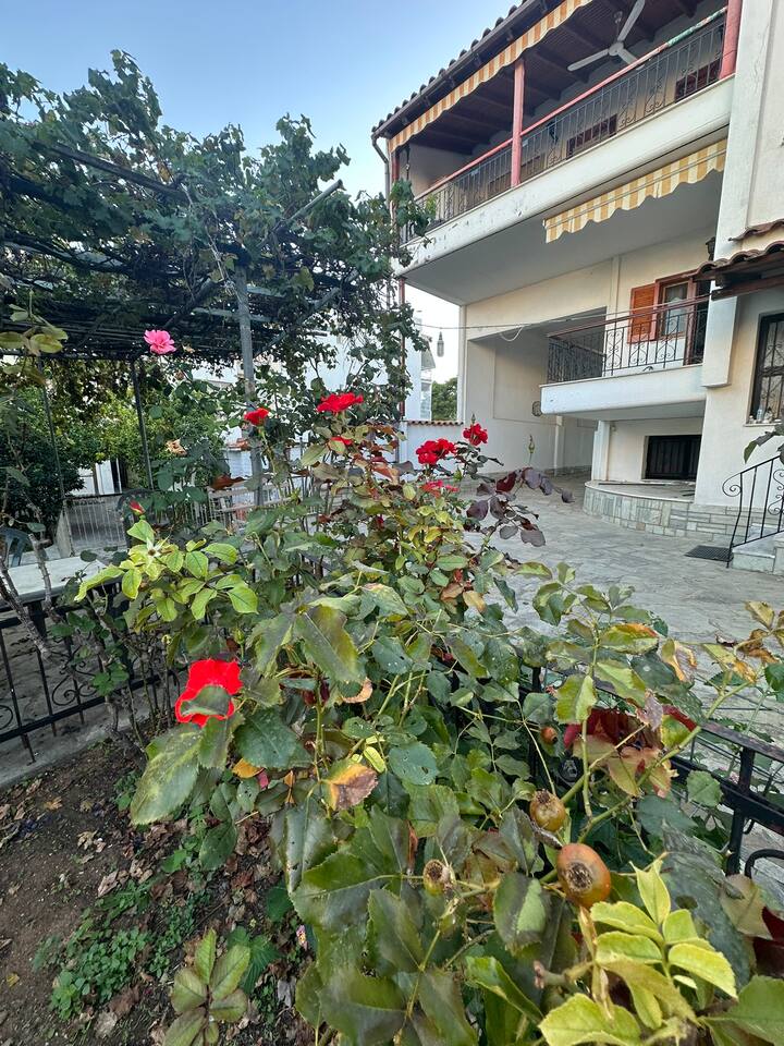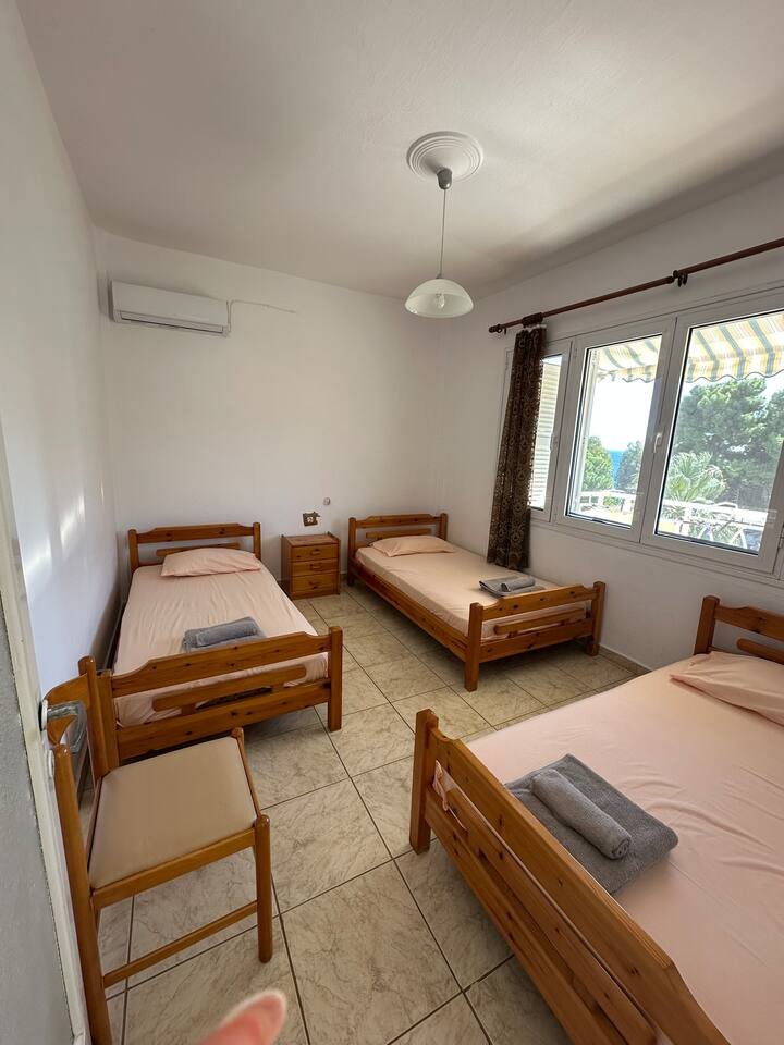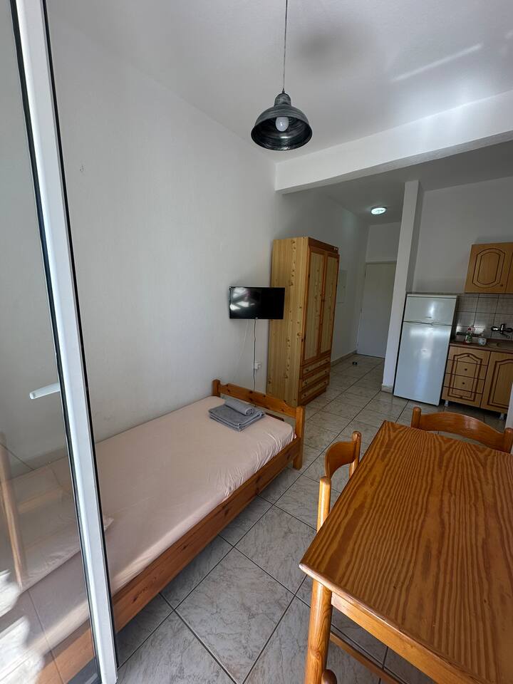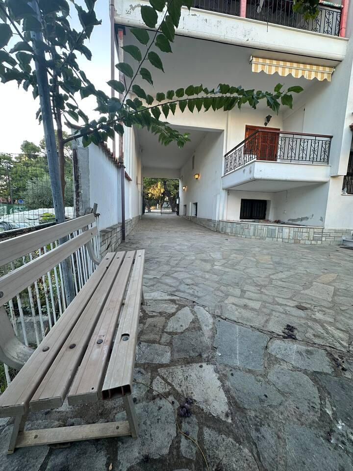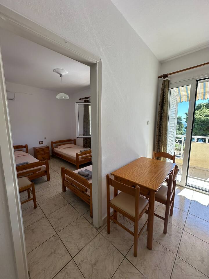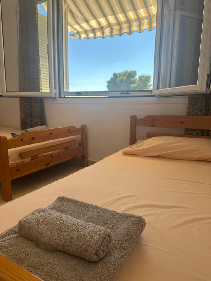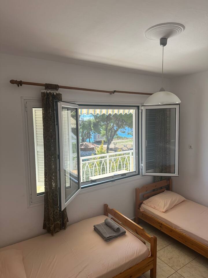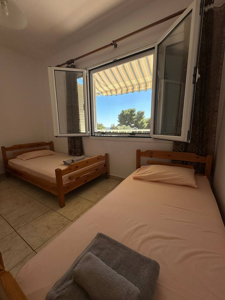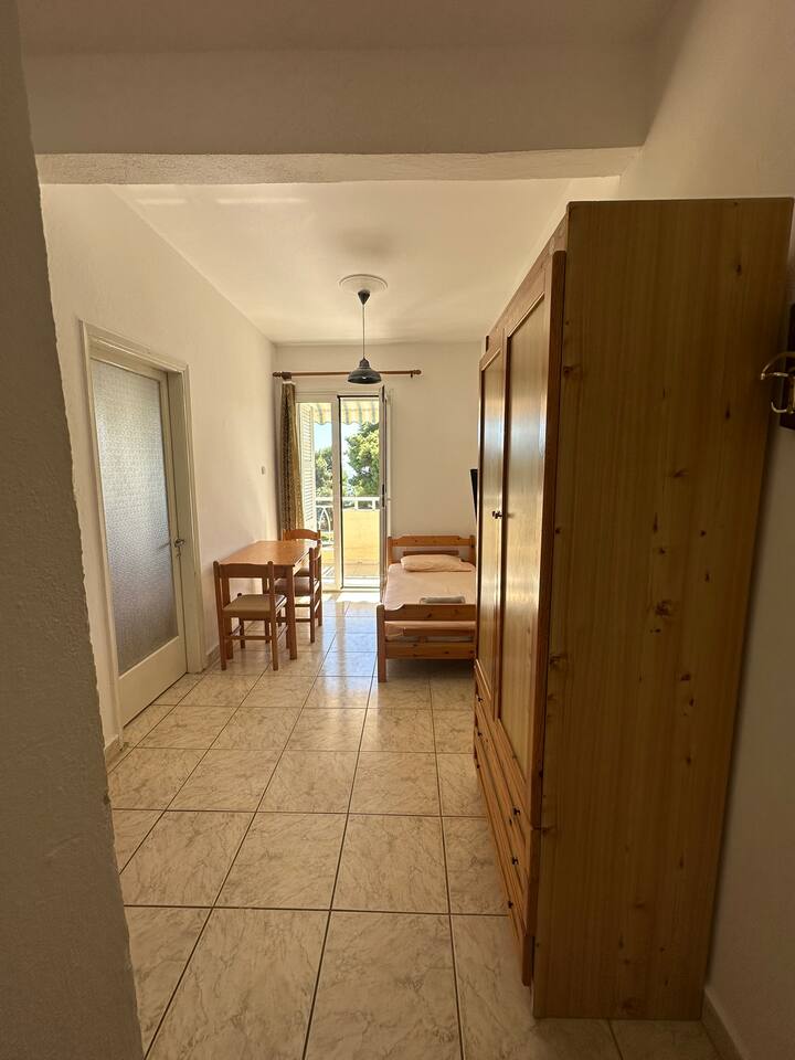 The accommodation is located in a unique place in the most central part of the village overlooking the sea. It is about 40m2 and is suitable for hosting 5 people. Also, the village is located at a distance of 5km from Nikiti and you can distinguish it for its beauty as well as its tranquility. From the apartment the access to the sea is at 50 meters as there are two supermarkets at 30 meters. There is a free parking behind the apparts and a park in front of it